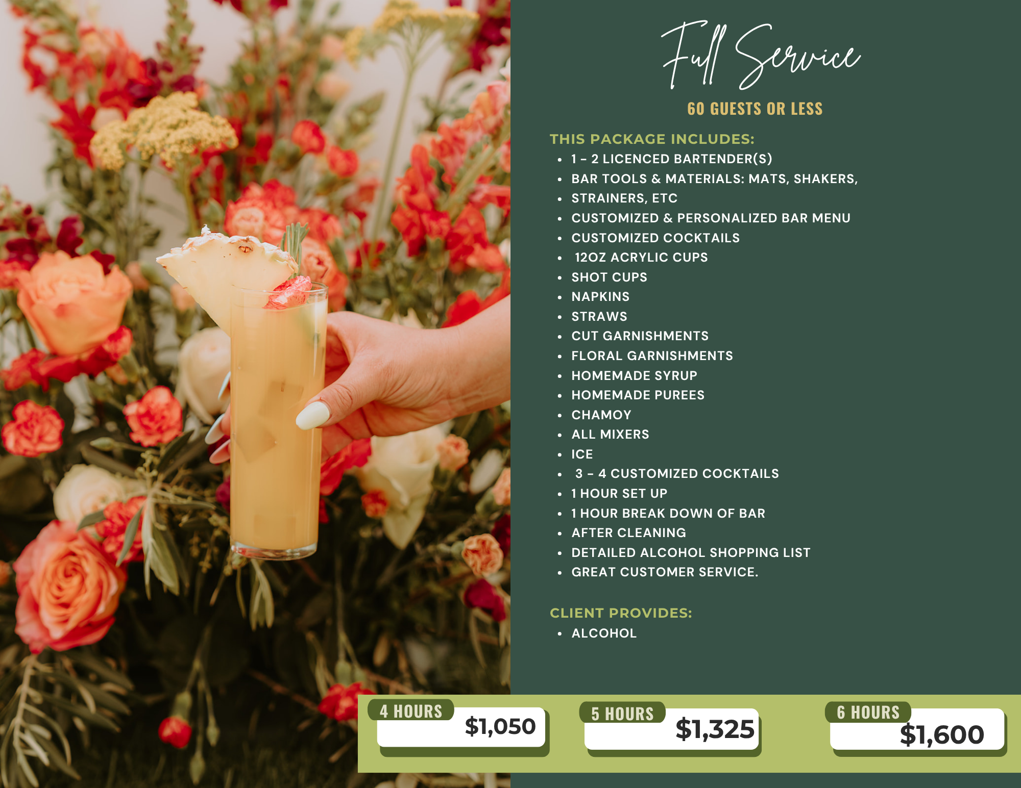 We want to see your vision like you do, and build on it to make it over the top. With full service, we supply everything- Stylish cups, straws, homemade syrups & purees, fruit and floral garnishments, etc, & detailed, custom additions to make your experience unique.